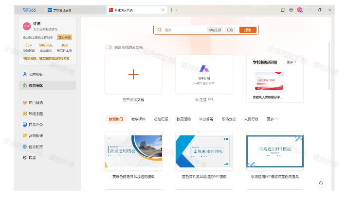 n 资源模板库 海量模板应有尽有,学习工作计划、调研报告、个人简历等,可轻松获得适配模板。 1.登录湖南师范大学账号,点击【新建】-【教育专区】 2.点击你想要的模板即可编辑使用