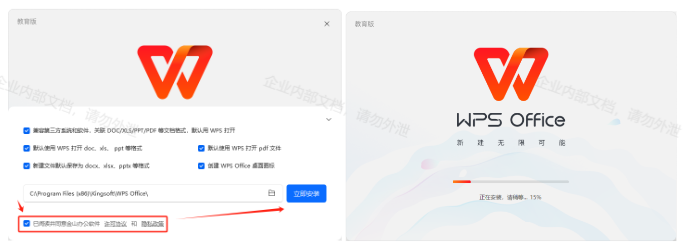 激活WPS 365 1.PC端 1)学校提供的安装文件 下载“WPS 365教育版”安装源文件之后,双击直接运行安装包,在完成安装后,会弹出学校统一身份认证,请输入学工号及统一身份认证的密码,即完成WPS 365师大专属账号的激活。 双击运行安装包(默认C盘,可更换安装路径)→安装完成。